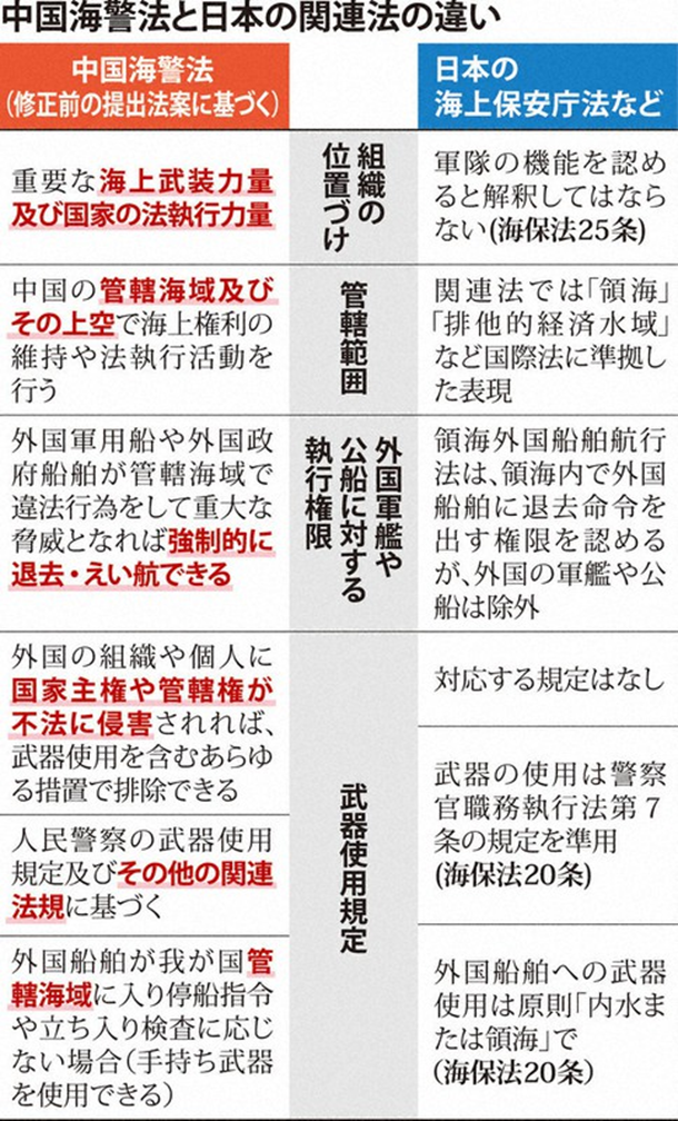 2021年2月に施行された中共の海警法は、海警に対し、以下を認めると解釈できる条文が含まれていたため、国際社会で問題視されました。